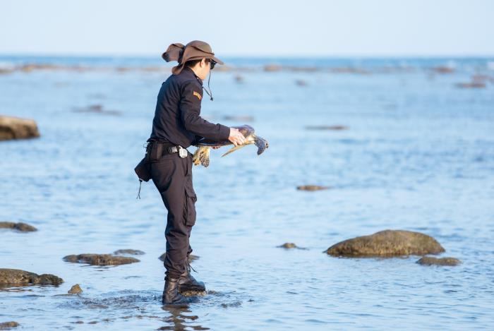 尹正和周冬雨来到丹伯灵自然保护区,在海边散步时偶遇了一只被搁浅在海边的海龟。尹正轻捧海龟来到海边,周冬雨也一路跟随陪同放生,但是由于海域较浅,海龟再次被石头卡住而无法前行。为了不让海龟在浅海再次被卡住,尹正单手抱起海龟走向更深的海域,不顾自己的鞋子和裤子被海水打湿,最终小海龟终于游向深海,成功与小伙伴汇合。网友直呼“太暖了!”