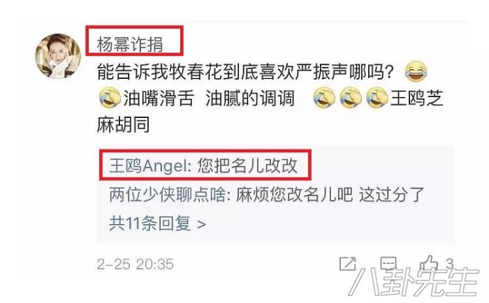 事情的起因是王鸥跟粉丝们就王鸥主演的新剧《芝麻胡同》讨论剧情的时候,对一位账号名称为“杨幂诈捐”的粉丝回复说“您把名儿改改”▼