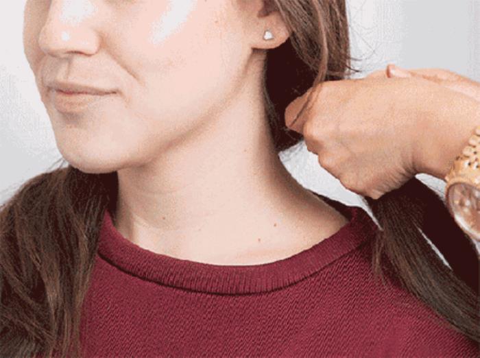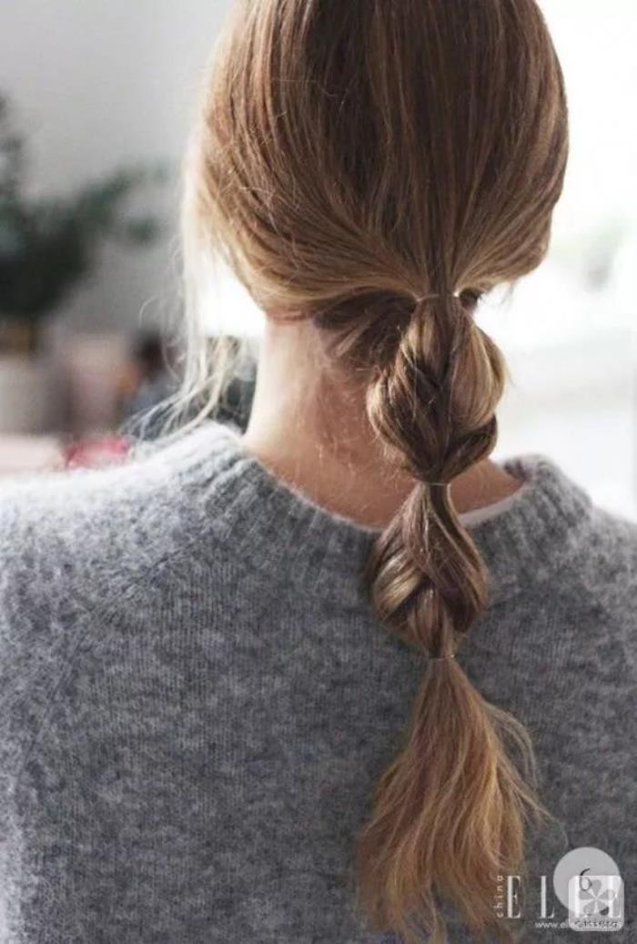 step3:将这缕头发融入到剩余的头发里,从脖颈处开始编三股辫,在发尾处用头绳扎住就可以了!