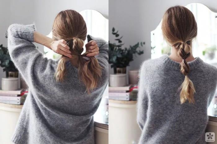 step1:扎一个松松的低马尾,将马尾上方的头发向外向后轻轻拉扯一下;