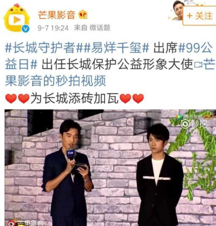 身穿黑色西装的千玺得体大方,千玺为长城添砖加瓦,正能量爆棚!