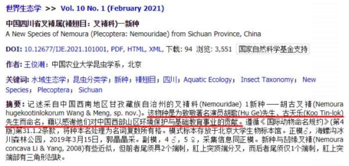 文章的摘要提到,该物种是为了致敬胡歌、古天乐而命名,以此感谢他们对中国西部山区环境保护与基础教育事业的贡献。