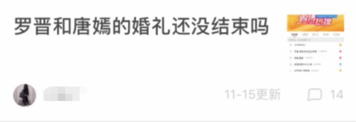 这场超强续航的低调婚礼到此时已经引发许多人出现不适感,再完美的婚礼弄成一个月的庆典,大家出现审美疲劳。消停了一周,11月15日“罗晋 婚礼时就这么穿吧”空降热搜,婚礼都过去多久了,五月份的过期糖真的有点吃不下。