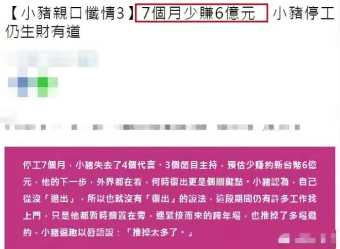 据罗志祥亲口说事业停摆后亏损了6亿新台币,折合人民币1.3亿元。