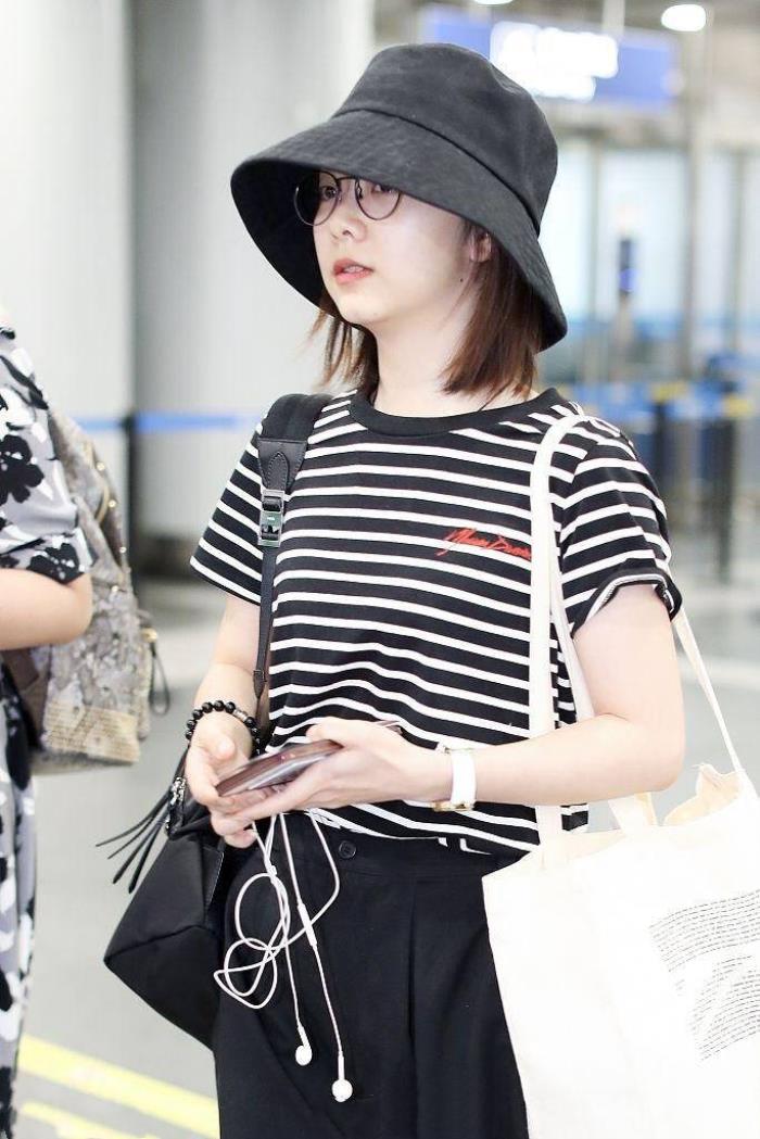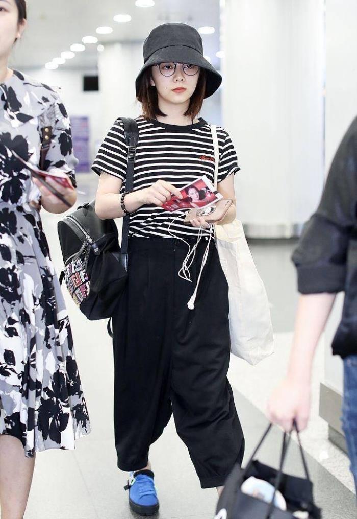 但是近日现身机场的这套搭配却让人大跌眼镜的感觉。与平时的减龄可爱风不同,这次谭松韵穿了一件黑白条纹t恤,搭配一条黑色阔腿裤,脚踩一双蓝色平底鞋。