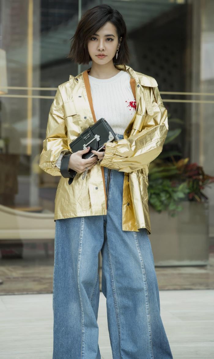 同样的搭配换一款金色外套就变得时髦个性十足。