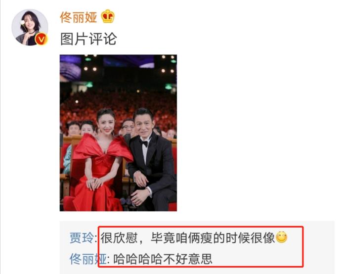 佟丽娅还开心地向贾玲炫耀:“哈哈哈哈不好意思”,对此贾玲估计是“咬牙”回复到:“很欣慰,毕竟咱俩瘦的时候很像”,贾玲和丫丫都有可爱的梨涡,瘦版贾玲的确也是女神级别的,看到丫丫和刘德华合影,贾玲也只能自我安慰一下了。