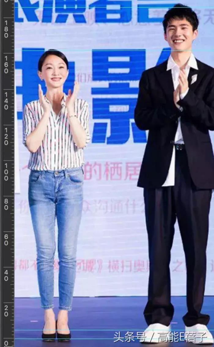 我们再换一张,这张可以看到傅菁脚下的高跟鞋增高了4cm,此时傅菁高174cm,可得傅菁净身高为170cm。李紫婷脚下高跟鞋增高6cm,李紫婷增高后高169cm,则她的净身高为163cm。