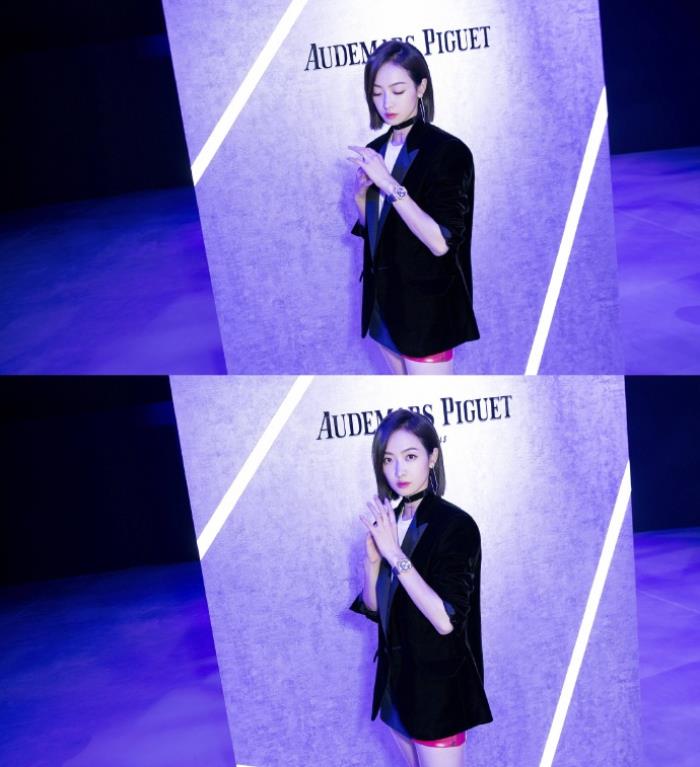 西装双排扣的设计更显庄重典雅,V字领的西装很好的展现出林允儿优美的锁骨线条,更显性感,同时更显林允儿脖子白皙修长。