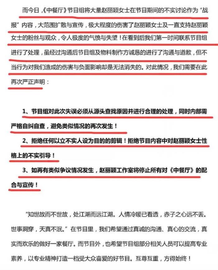 事后,赵丽颖工作室对《中餐厅》道歉作出回应,节目组必须从源头查找原因,再次避免有类似情况再次发生,拒绝节目内容对赵丽颖性格上的不实引导,如果下次再有类似争议的事情发生,赵丽颖方将停止对中餐厅的配合与宣传!