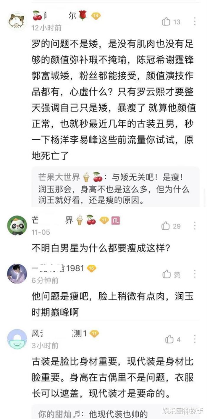有网友称:“罗的问题不是矮,是没有肌肉也没有足够的颜值弥补瑕不掩瑜”,也有人称:“他的问题是瘦,不明显男明星为什么都要瘦成这样”。