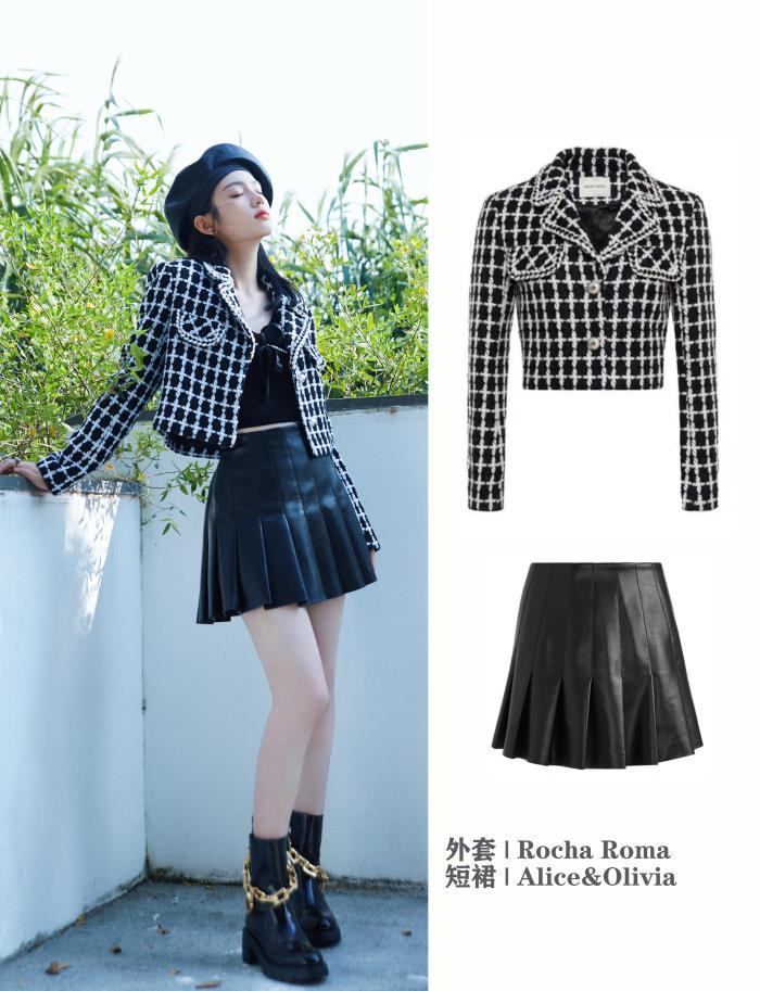 周也搭配了有丝带蝴蝶结装点的黑色针织背心、皮质百褶短裙、酷甜短靴和皮革贝雷帽,全套黑白配的穿搭,却显得甜美又有气质~ ↓