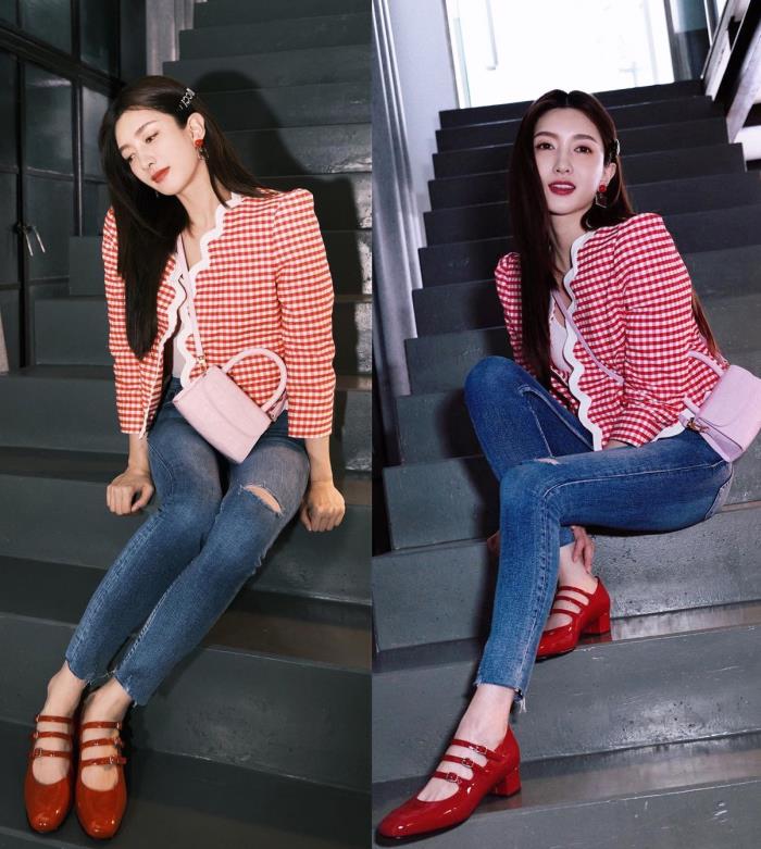 白色波浪边设计的粉色格子小外套,江疏影搭配紧身白色打底衫、蓝灰牛仔裤,优雅甜美的轻熟风,约会或是通勤穿都适合~ ↓