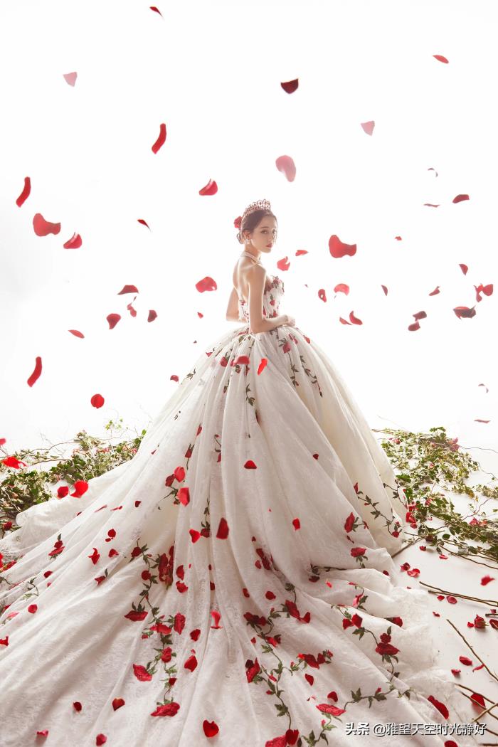 玫瑰刺绣拖尾白纱裙,高贵冷艳、气质非凡。