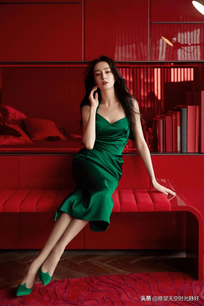 墨绿色挂颈长裙,轻快焕然、妩媚浪漫。