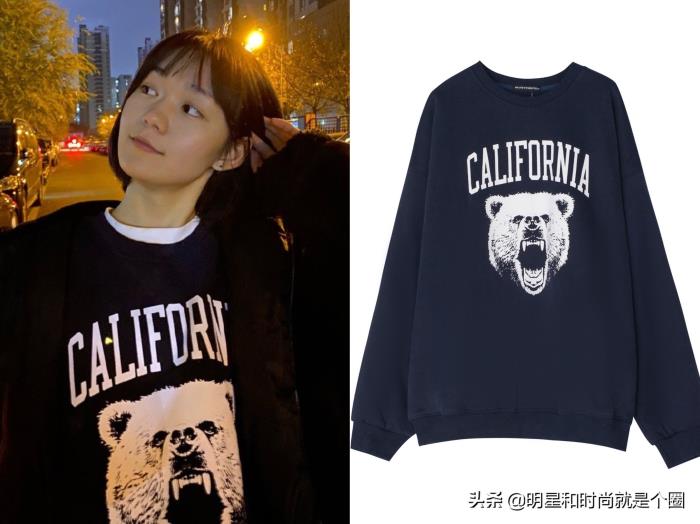 段奥娟晒照片,身穿Brandy Melville加利福尼亚熊印花卫衣。