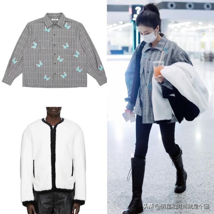 白鹿现身杭州机场,身穿13 De Marzo灰色格纹衬衫、手拿we11done白色毛绒外套,高高的马尾,一双及膝长靴,看起来真好看,大家都可以来一套这样的打扮。