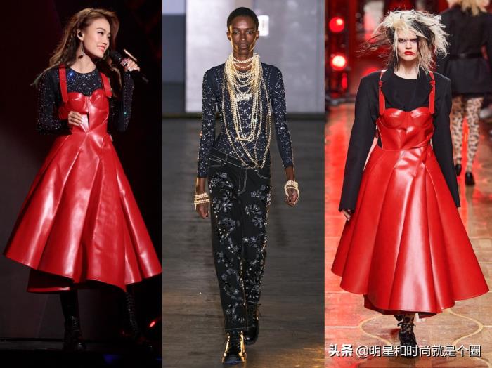 《我们的歌》,容祖儿的另外一身搭配,Koché 2020秋冬系列亮片针织衫、Junya Watanabe 2020秋冬系列红色吊带皮裙,妈耶,最右边模特的嘴巴太吓人了。