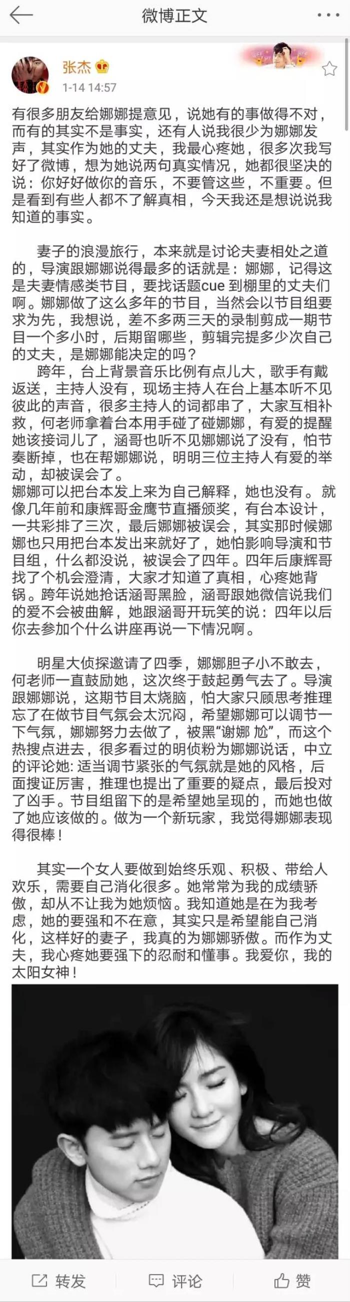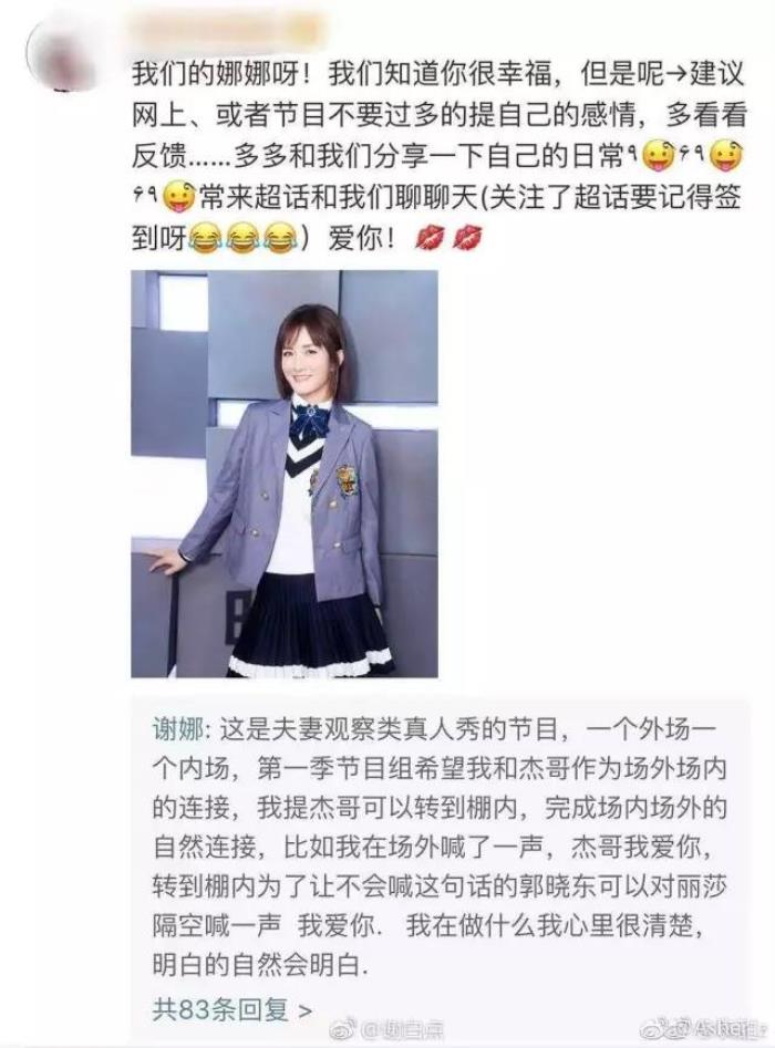 一条妥妥地为谢娜个人形象担忧的微博,但在谢娜看来:wtf!节目中秀恩爱是节目组的要求,我上节目要满足节目组的要求啊!