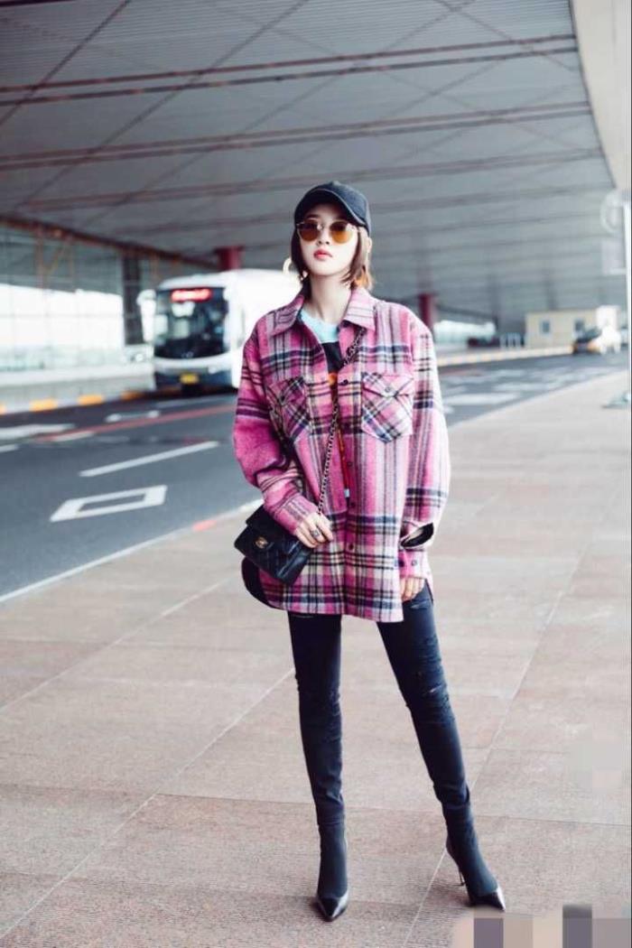 简约T恤打底显得十分慵懒随意,外搭玫红色格子外套,显得十分清新文艺范儿,同时也含有几分少女心,下搭黑色长裤与黑色高跟鞋,更添几许神秘高贵的气息。