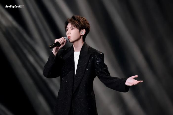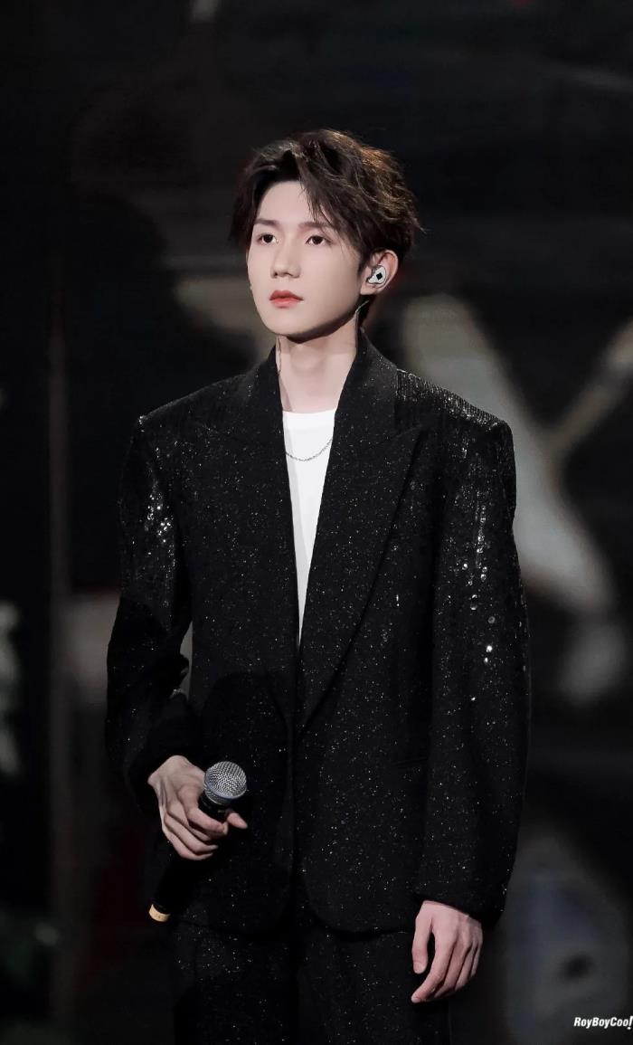 利落轮廓优雅迷人,肩部低调水滴刺绣铺满星光,映照朗目清俊的舞台瞬间。