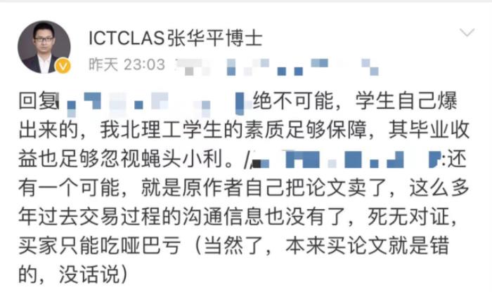 11月1日,北京理工大学副教授张华平@ICTCLAS张华平博士 在认证微博发文称,他带的研究生的论文被某校研究生陈某100%全文抄袭。