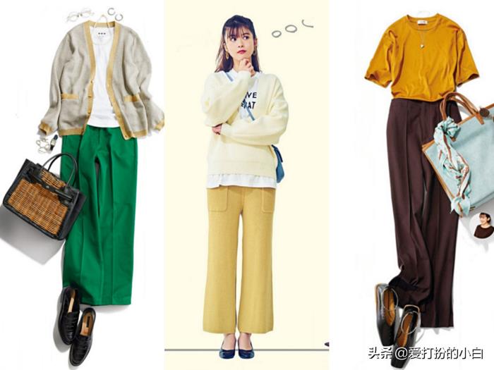 用一些亮眼的颜色是一个很容易抓住别人的视线的方式,像这种鲜亮色可能很多人害怕不好不配色,其实非常简单,比如说下面的绿色搭配的是灰色外套和白色T恤,黄色裤子和杏色卫衣,姜黄色T恤搭配褐色西裤,这些配色都是在找黑白灰,不然就是找同类色系的