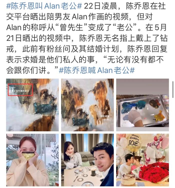 陈乔恩近日疑似有好消息,深夜晒出照片,并称呼Alan为老公,要知道之前她一直都称呼他为曾先生,难道是已经领证结婚了?