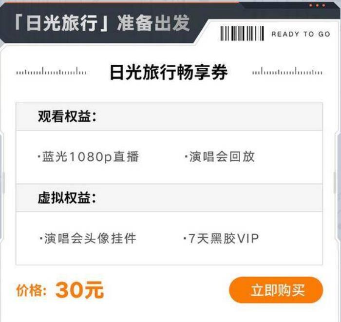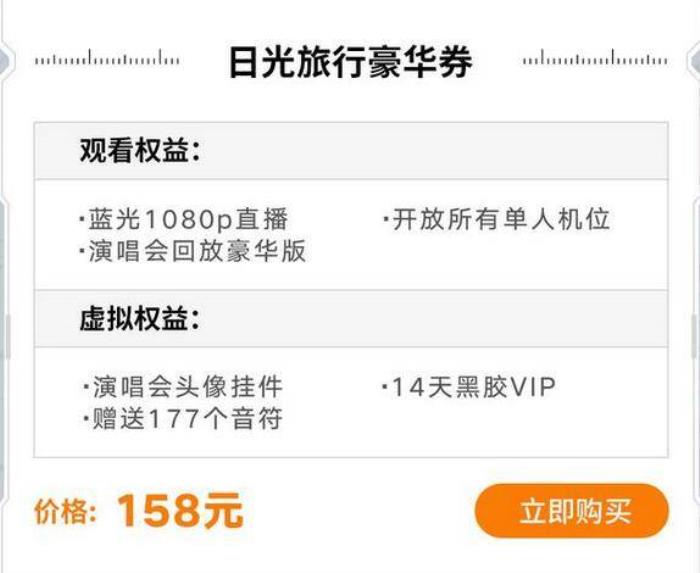 粉丝发现,这3档票价还对应了不同的观看体验和礼品,首档30元,可观看现场直播;第二档为158元,多出了“所有单人机位”“演唱会回放豪华版”“14天黑胶VIP”的权限;到了最贵的860元,则包含”“限定礼实物周边和主题盲盒购买特权”和“一年黑胶VIP”“赠送877个音符”等虚拟权益。
