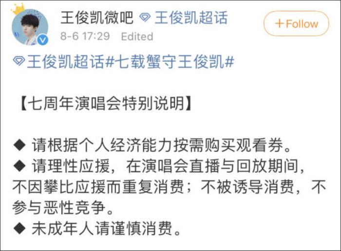 这一举动也引发了成员粉丝团的警惕,为防止“诱导消费”“恶性竞争”,8月6日下午,@王俊凯微吧 @王源粉丝联合应援博 @易烊千玺微吧 纷纷发布公告,呼吁粉丝理性应援,保持理智,不因攀比应援而重复消费,不被诱导消费,不参与恶性竞争,未成年谨慎消费。