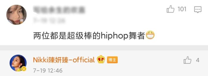 Nikki是第一季中表现最出色的女舞者之一,黄子韬看到Nikki以后,直接表示想跟着她学习舞蹈,而当看到Nikki淘汰以后,黄子韬也表示,完全没想到陈妍臻会被淘汰,就算是节目录制接近尾声,黄子韬也非常遗憾陈妍臻没有选择自己。