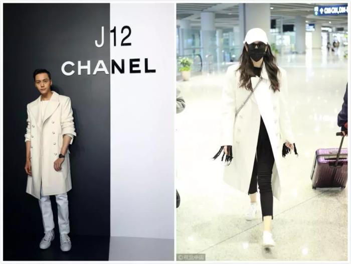 陈伟霆身穿香奈儿风衣,搭配白色的T恤,白色的裤子和鞋子,一身的白色搭配,非常的绅士精致。迪丽热巴和他同穿一件风衣,也非常的帅气、干练!这款男士风衣,宋茜也有穿过!