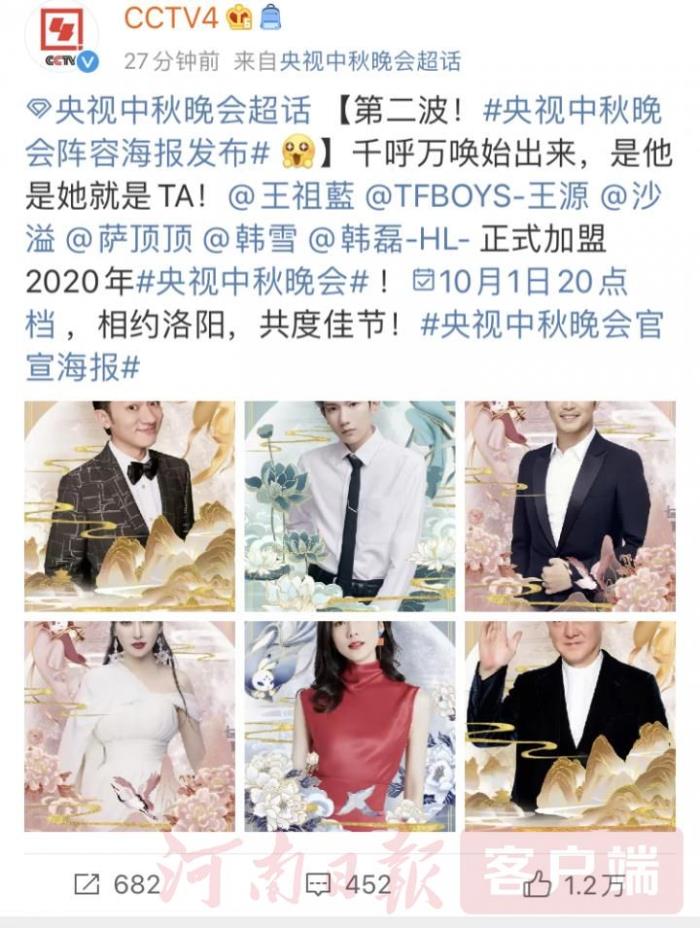 继9月4日央视官宣:江疏影、孙楠、李宇春、张杰、張信哲、周深、郎朗、秦岚、鹿晗等嘉宾加盟央视中秋晚会后,第二波嘉宾也来啦!王祖蓝、王源、沙溢、萨顶顶、韩雪、韩磊正式加盟央视中秋晚会。