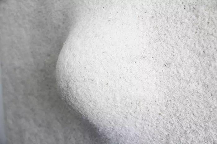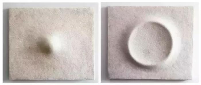 “《不可进入》是对雕塑材料和形式的探索,材料本身的质感使我很感兴趣。”于海曾在内蒙古生活过一段时间,羊毛的质感让他感到着迷,它可以柔软,也可以做成坚硬的毛毡靴,散发着草原上的气息……《不可进入》使用的材料正是他从内蒙古运回的用来做靴子的那种粗糙坚硬的初剪羊毛。“羊毛部分用针毡法这种带有刺痛感的方式将羊毛戳进画布,在画布表面塑造起一个无缝的形,随着厚度的增加在张力的作用下羊毛隆起形成坚硬的空间,将‘扩张’和‘收缩’的身体感受转换成极简的形式。”在这件作品里,于海表达着他最初关于羊毛的惊喜、温暖、清晰的个人感受。制作上针刺的坚硬与痛感,和看起来柔软的感知形成反差,这正是于海对雕塑材料触觉感受力的思考。