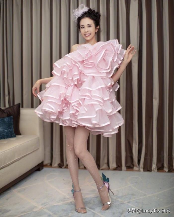 柔粉色的波浪裙子带有十足的减龄感,女神就是能够完美驾驭一切仙气十足的衣服,花边波浪的设计使得衣服整体看起来十分具有造型感和层次感,同时也将莫文蔚修长的双腿衬托的更加纤细白皙,尤其是蝴蝶造型的高跟鞋的搭配,更加将女性的精致凸显。