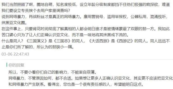 网友们总结来说就是从这些事情中认为肖战有为自己间接发声,而且是恶向引导的发声。如果作者没有通过相应的事情来反对的话,文章的观点的论据(即:肖战没有义务管理粉丝)是否与观点相矛盾了呢?