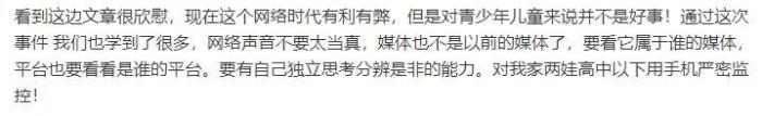 现在这个网络时代有利有弊,但是对青少年儿童来说并不是好事!通过这次事件我们也学到了很多,网络声音不要太当真,媒体也不是以前的媒体了,要看它属于谁的媒体,平台也要看看是谁的平台。要有自己独立思考分辨是非的能力。对我家两娃高中以下用手机严密监控!