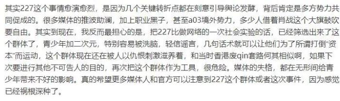 其实到现在,我反而最担心的是,把227比做网络的一次社会实验的话,已经筛选出来了这个群体了,青少年加二次元,特别容易被洗脑,轻信谣言,几句话术就可以让他们为了所谓打倒“资本”而运动,这个群体现在还在被人以仇恨刺激滋养着,如果下次要进行其他不可告人的目的,再次把这个群体作为工具,很危险。
