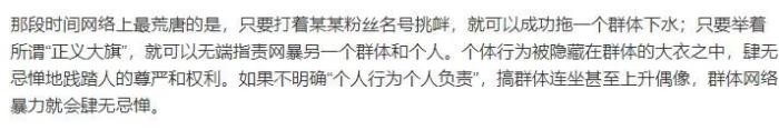 那段时间网络上最荒唐的是,只要打着某某粉丝名号挑衅,就可以成功拖一个群体下水;只要举着所谓“正义大旗”,就可以无端指责网暴另一个群体和个人。个体行为被隐藏在群体的大衣之中,肆无忌惮地践踏人的尊严和权利。如果不明确“个人行为个人负责”,搞群体连坐甚至上升偶像,群体网络暴力就会肆无忌惮。