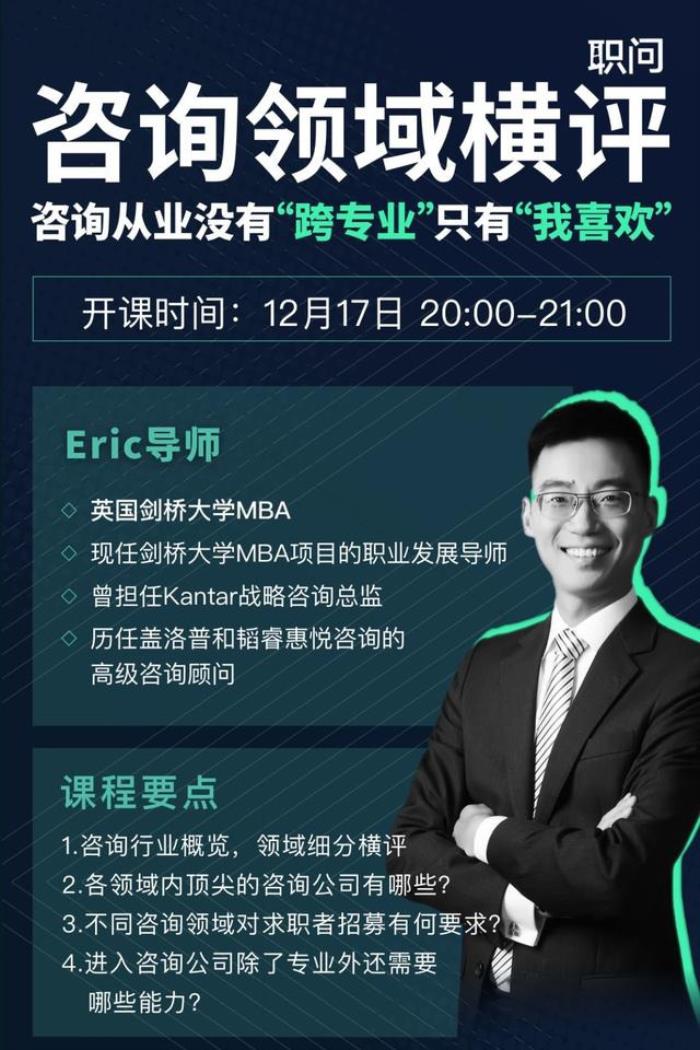 为此,我们请到咨询领域的资深导师Eric 精心为大家准备了【咨询领域横评】公开课,帮助想要深入了解和进入咨询行业的同学们解答关于咨询行业的各种问题: