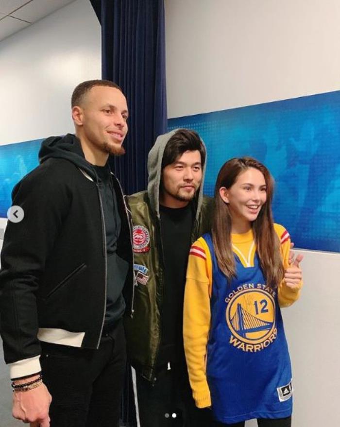 还有一张照片是周杰伦站在昆凌和库里中间,有网友戏称周董“醋坛子撒一地”。