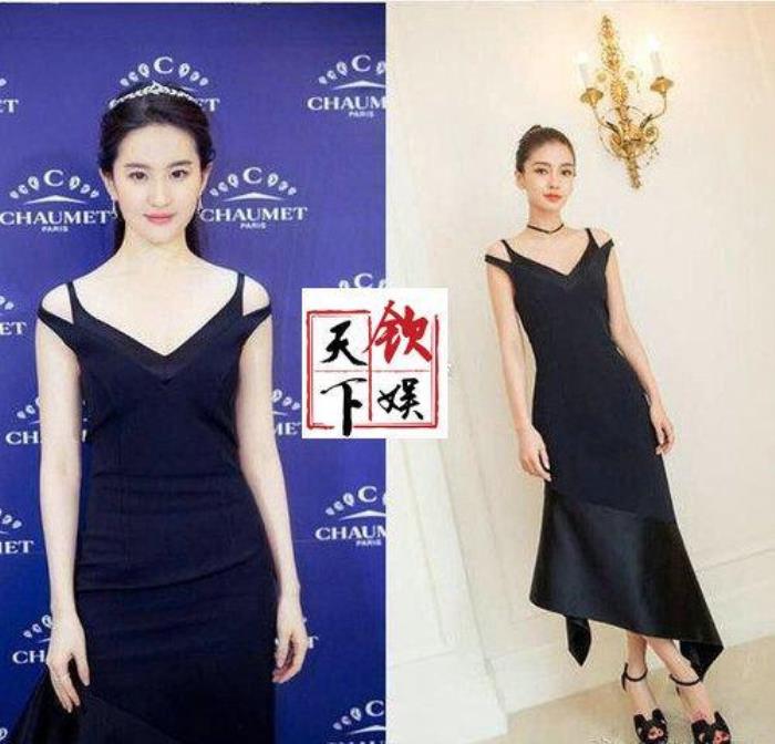 此次撞衫,两人同穿黑色晚礼服,刘亦菲胜在能把黑色都穿的那么有仙气,公主范十足,Angelababy胜在够瘦,肩膀上看着更小巧!