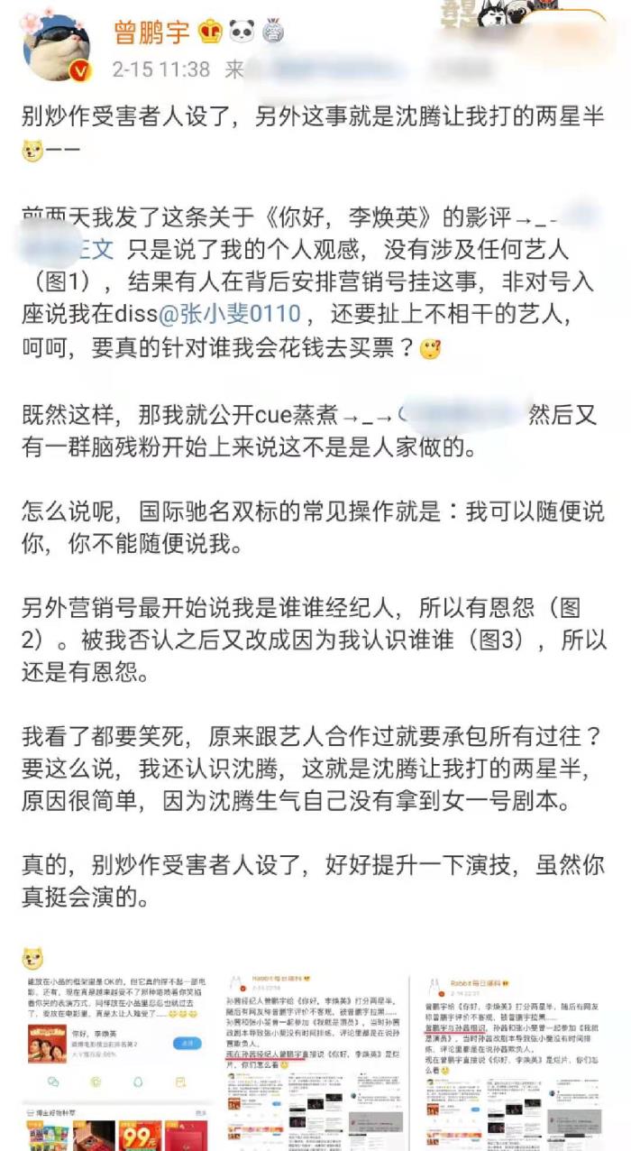 随后呢,与张小斐有过不愉快过往的孙茜经纪人曾鹏宇,连着几天不闲着公开diss张小斐,并给《你好,李焕英》打低分。