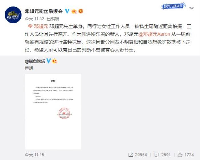 今天早上,邓超元所在公司发声明表示该女生是工作人员,随后,后援会回应说是工作人员让邓超元先行离开。