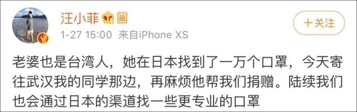 演员大S(徐熙媛)则在日本购买了1万个口罩后,寄往武汉,27日,大S丈夫汪小菲也通过微博公开了这一事件。