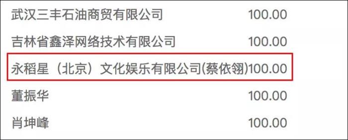 而歌手蔡依林则以本名蔡依翎,通过大陆公司永稻星捐出100万元人民币;
