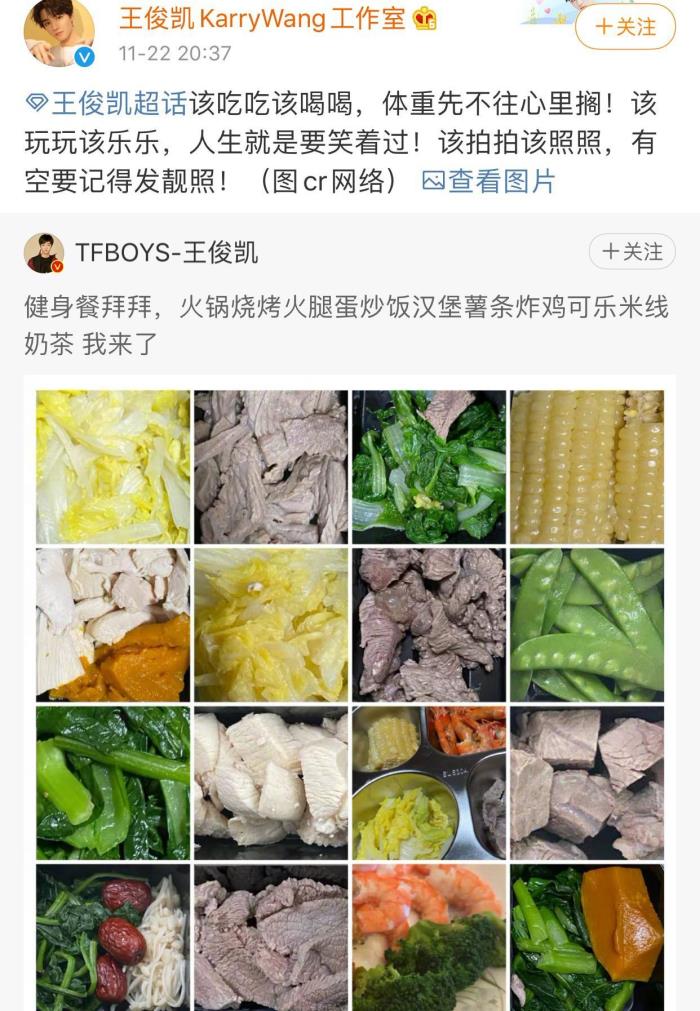 11月22日,王俊凯在个人社交平台账号发文:“健身餐拜拜,火锅烧烤火腿蛋炒饭汉堡薯条炸鸡可乐米线奶茶,我来了 。”并配图晒出了自己这段时间吃的健身餐,各种的沙拉鸡胸肉,让人看着就十分没有食欲。