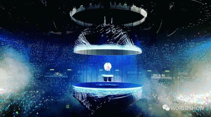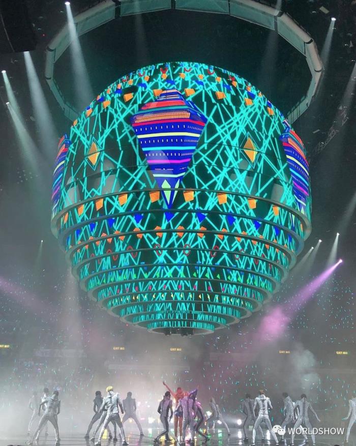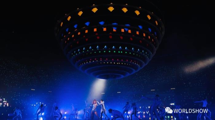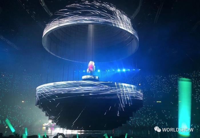 也可以将其中一半变成半圆型的“小舞台”,又可以拆成环状。故此,Joey唱出《空港》时,大家会看到这个圆球会慢慢分裂成一半,唱出《心之科学》时,圆球又会重组成漏斗状。