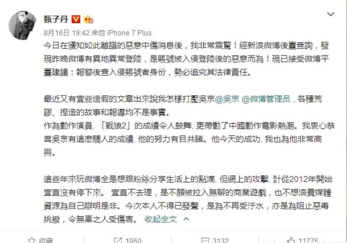 ↓↓↓不过在甄子丹发出澄清吴京的文字后,网友们大批的支持追随着,甄子丹在江湖上还是有一定的地位的