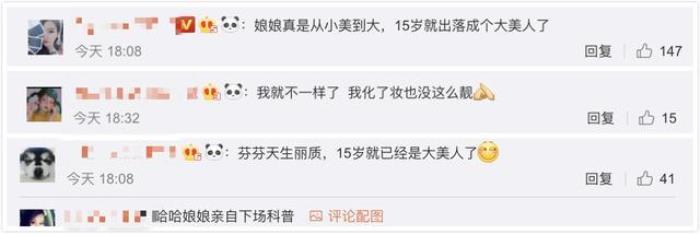 网友评论道:娘娘亲自下场科普,娘娘真是从小美到大,15岁就出落成大美人了。